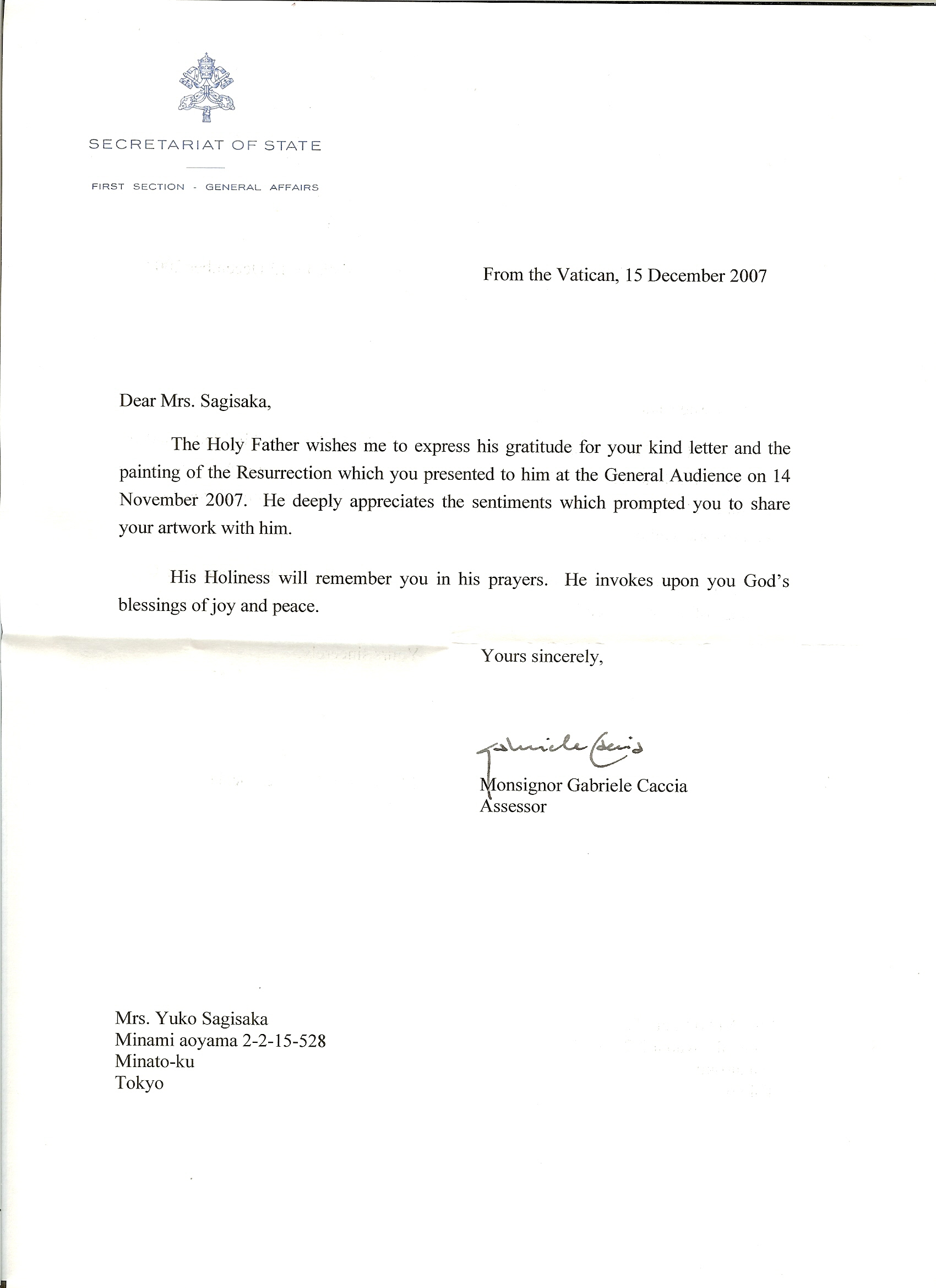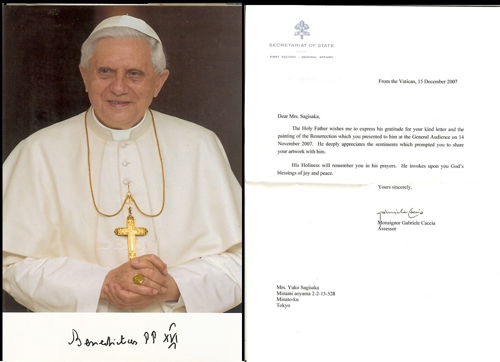 バチカン・ローマ法王ベネディクト16世より感謝状(「復活Resurrection」献上)